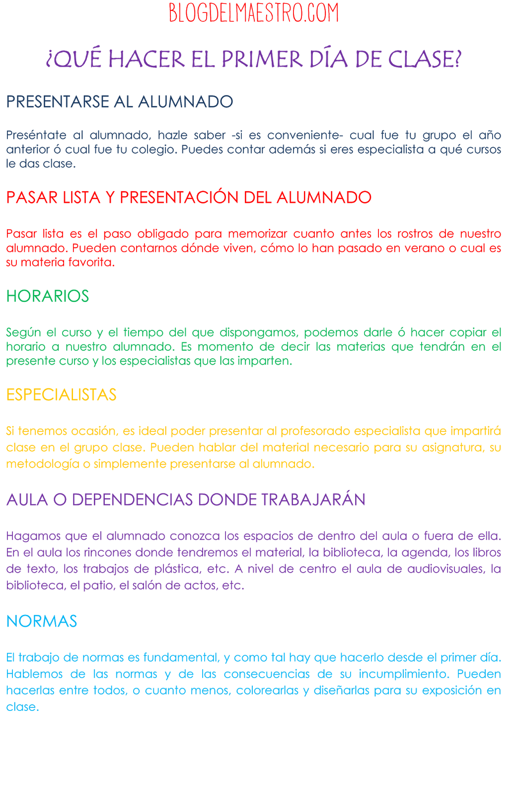 En Andalucía, la Educación Primaría da comienzo este miércoles día 10, habitualmente con un horario reducido que sirve de presentación entre docentes y alumnado. Días antes es inevitable plantearse qué hacer en el primer día de clase. Nuestro alumnado puede ser un nuevo grupo o la continuación con el del curso anterior. En cualquiera de los casos es fundamental preparar nuestro primer día con ellos. ¿Qué hacer el primer día de clase?. Todos tenemos nuestras propuestas y nuestra metodología, pero quizá esta recopilación de ideas te facilite la tarea. En caso de desearlo en otro formato puedes solicitármelo en la sección contacto. ¡¡Espero que sea de utilidad!!