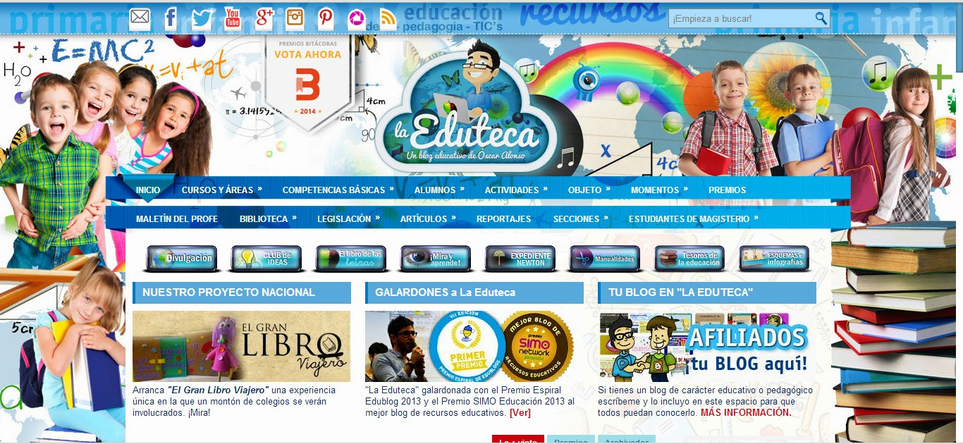 En el momento que descubrí la eduteca y ví su amplio abanico de recursos, comprendí que había llegado muy tarde a esta página. Mucho más tarde de lo que debiera, puesto que hubiese enriquecido todos los años que llevo ejerciendo como docente. Se trata de un blog, con disfraz de web, muy atractivo en cuanto a diseño y muy bien trabajada. Se percibe que su autor, Óscar Alonso además de tener un buen manejo de la informática le dedica muchas horas. El resultado no puede ser mejor. ¡¡Enhorabuena!!