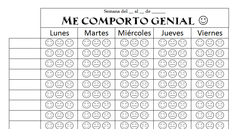 Se trata de un cuadrante semanal con caritas para colorear. Al terminar cada jornada, el docente coloreará la VERDE, AMARILLA ó ROJA según haya sido el comportamiento de cada alumno durante la jornada escolar. Con dicho registro se pueden establecer determinados premios para los que hayan logrado mantener sus cuadrantes de caritas felices y sonrientes. Un recurso que les motivará a un mejor comportamiento y ayudará a mantener un clima de clase adecuado :-)